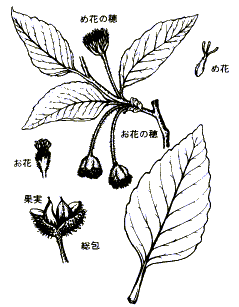 互生。長さ5〜10p,はば3〜5p。ふちは波のように切れこむ。秋に紅葉する。